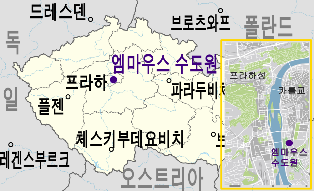 엠마우스 수도원은 1347년 신성로마제국 황제이자 보헤미아 왕이었던 카를 4세가 설립했습니다. 당시 라틴어 전례권이었던 보헤미아에서 슬라브어 전례를 거행할 수 있도록 교황의 허락을 받아 세운 드문 베네딕도회 수도원이었습니다. 그래서 ‘슬라브인의 장소’라는 뜻의 ‘나슬로바네흐’라고도 불립니다.