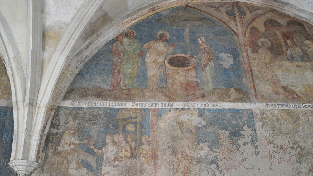 이 수도원이 왜 부활 시기에 어울리는지 회랑에 들어서는 순간 실감하게 됩니다. 1360년경 회랑과 주변 공간에 제작된 벽화 연작은 원래 약 90개의 장면으로 구성된 방대한 성경 공부의 장이었습니다. 안타깝게도 석회화(프레스코화) 특유의 취약성과 이후 보수, 폭격으로 많은 부분이 유실되었지만, 남은 벽화만으로도 구원사를 따라 걸을 수 있습니다.