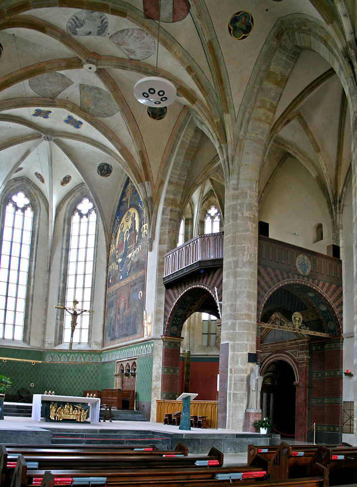 성당 안으로 들어서면, 바깥의 인상과 전혀 다른 고요가 밀려듭니다. 세 개의 본랑 높이가 같은 홀 형식 구조 덕분에 공간은 하나의 거대한 기도실처럼 차분하게 다가옵니다. 안을 천천히 바라보면, 서로 다른 시대의 흔적이 하나의 질서 안에서 조용히 어우러져 있습니다. 14세기 고딕의 골격 위에 후대의 손길이 덧입혀졌고, 19세기 말에는 독일 보이론 예술학교 수도자들의 채색으로 전례의 공간이 새로운 옷으로 갈아입었습니다.