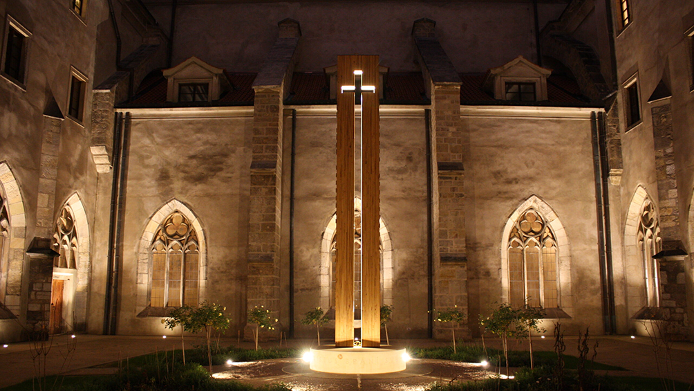 2016~2017년 복원된 엠마우스 수도원 ‘천국의 뜰’. 회랑의 고딕 창과 오래된 석벽으로 둘러싸인 빛의 십자가가 중세 수도원과 오늘의 영성을 하나로 묶어 드러낸다.