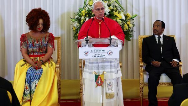 2026년 4월 15일, 레오 14세 교황이 카메룬 대통령궁에서 폴 비야 대통령과 부인 샹탈 비야 여사와 함께 연설하고 있다. 93세인 비야 대통령은 역대 세계 최고령 대통령이다. OSV
