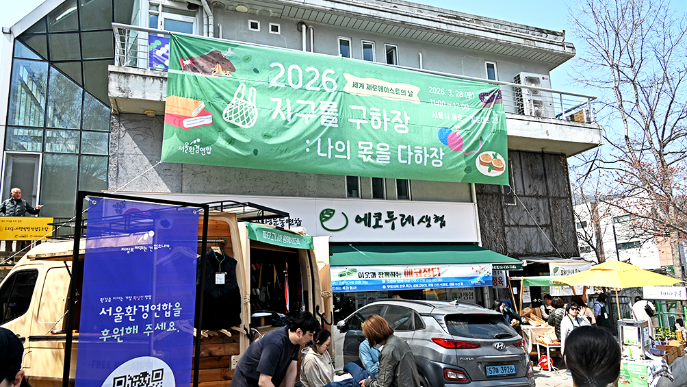 환경 단체 서울환경연합이 3월 28일 ‘세계 제로웨이스트의 날’을 맞아 서울 누하동 환경운동연합 건물 일대에서 ‘지구를 구하장’(이하 지구장) 행사를 개최했다. 지구장은 서울환경연합이 유엔환경계획(UNEP)에서 지정한 세계 제로웨이스트의 날을 기념하고자 2022년부터 개최하고 있는 ‘쓰레기 없는 장터’ 행사로 △제로웨이스트 부스 △업사이클 부스 △비건 푸드 판매 부스 등을 운영하며 친환경 소비 진작 및 순환 경제 활성화 등을 알리는 시간으로 꾸려지고 있다.