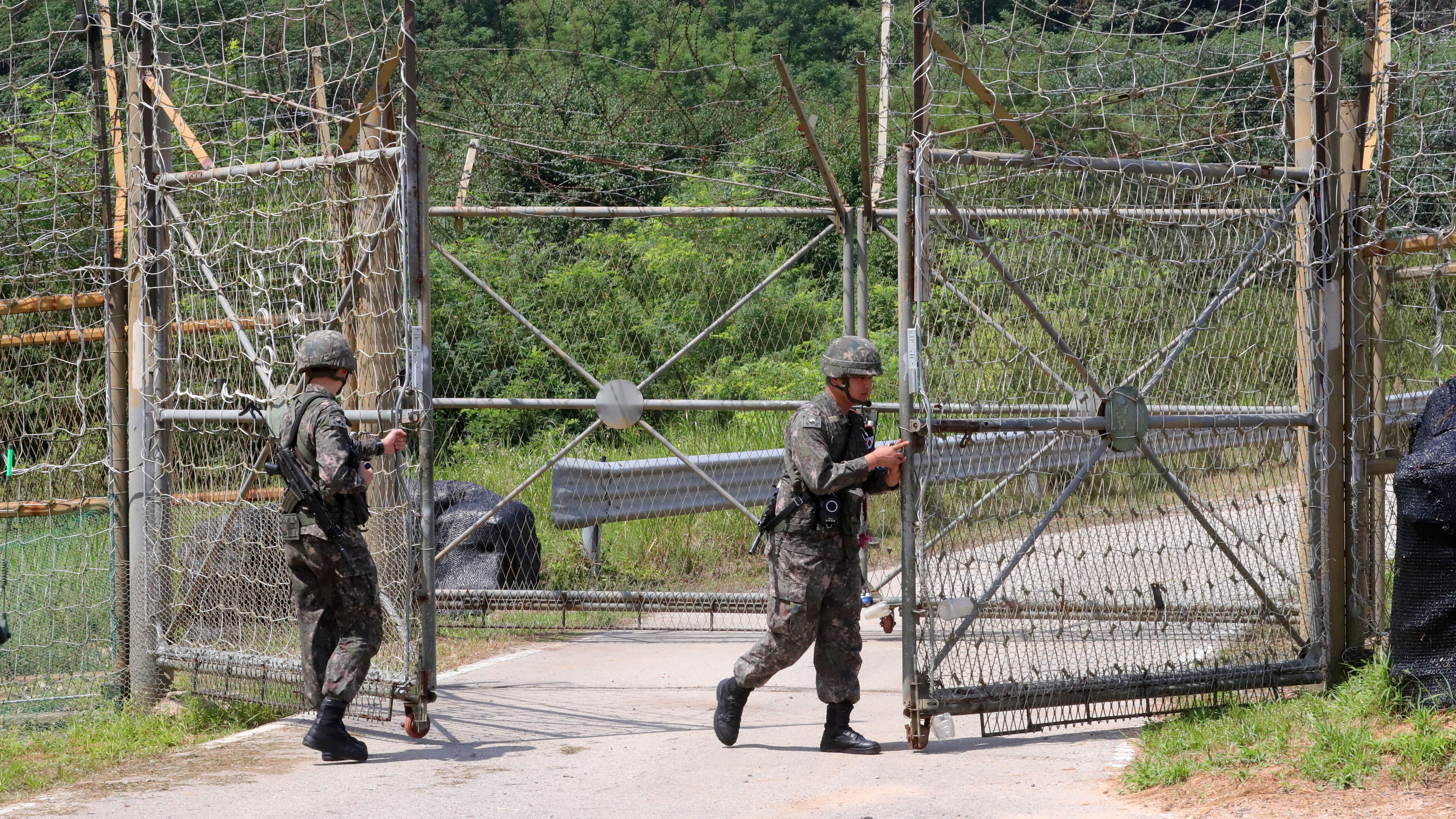 2019년 8월 9일 오전 경기 파주시 DMZ 앞에서 파주 DMZ 평화의 길 개방 탐방객들의 출입을 위해 군인들이 통문을 열고 있다. 뉴시스