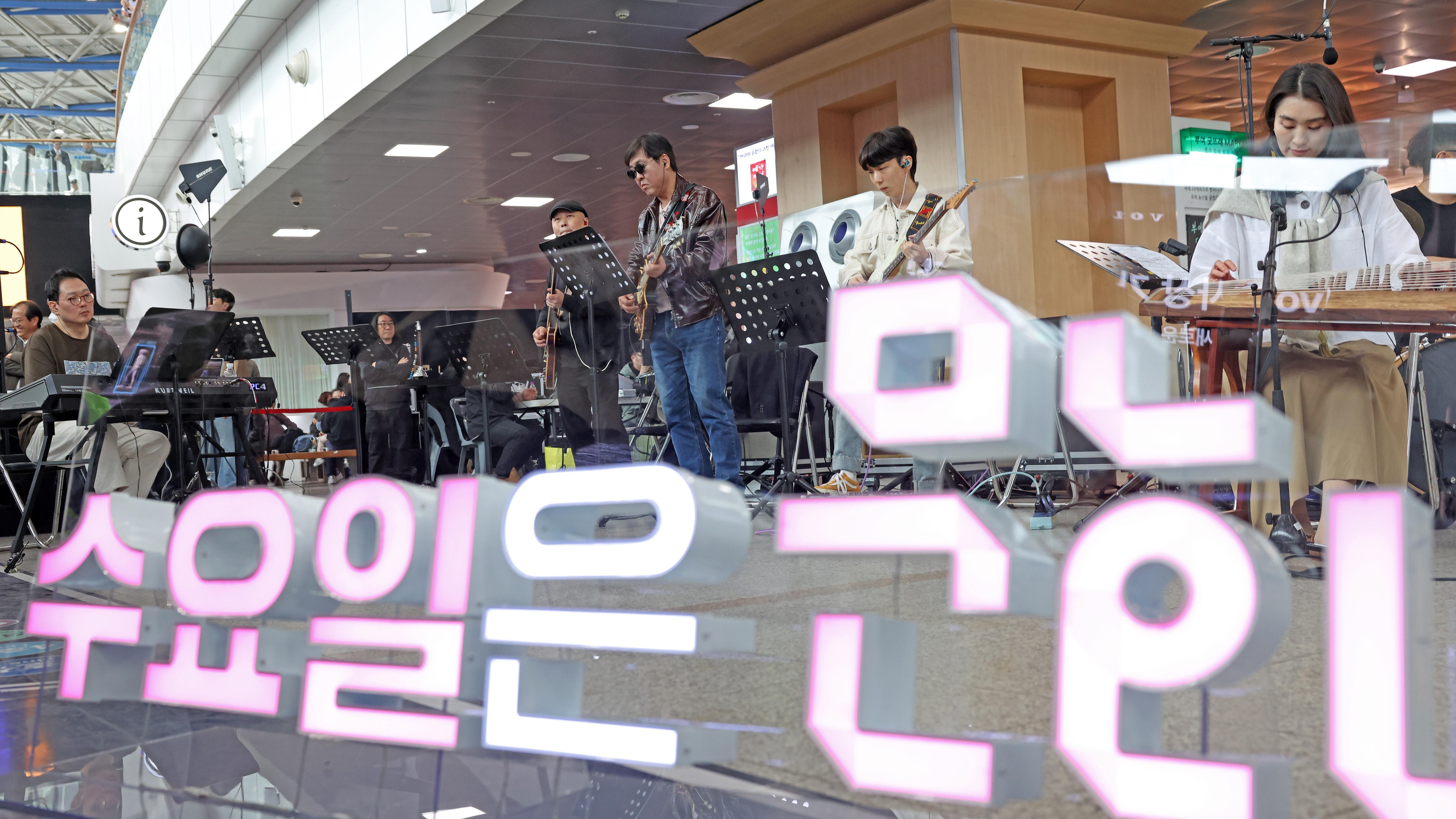최휘영 문화체육관광부 장관이 1일 '문화가 있는 날'의 매주 수요일 확대 시행을 기념해 서울역에서 열린 '수요일은 문화요일, 문화로 놀자!' 공연에 참여해 기타를 연주하고 있다. 뉴시스
